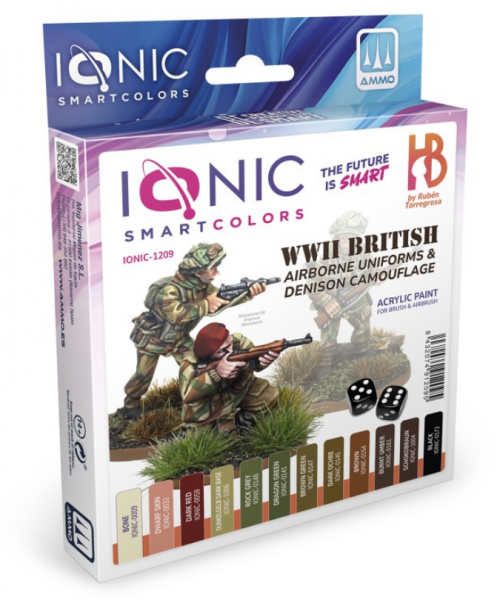 The Ionic Smart Colors WWII British Camouflage & Airborne Denison set includes 12 acrylic paints specially chosen to provide the essential tones for painting uniforms for WWII British and Commonwealth airborne forces, as well as the Pixie suit (a British tank crew oversuit also used by soldiers at the end of the Second World War.